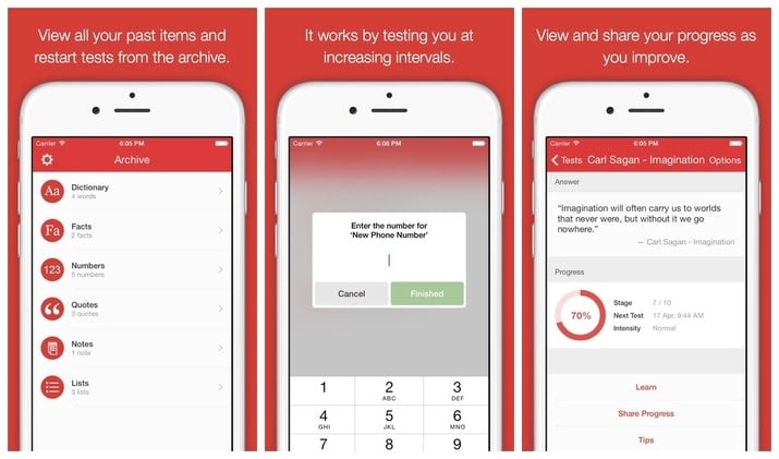 Eidetic uses spaced repetition in an effort to help you remember things you want from names to phone numbers. The levels of testing increase as you improve and sharpen skills. It is available for iOS and Android.